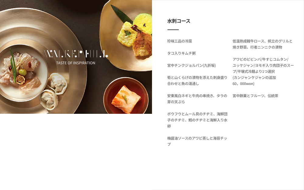 朝鮮時代の支配階層である士大夫の料理、そして宮廷料理の饌品単子(チャンプンタンジャ、膳に上る料理が書かれた古文献)をアレンジした料理がお楽しみいただけます。韓国各地の旬の食材を活用して、古文献の考証に基づき匠の技で仕上げたウォーカーヒルを代表する韓国料理店です。